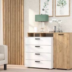 Комод имеет 4 вместительных ящика, отделение с полкой за распашной дверцей, открытые ниши. Функциональный комод может служить подставкой под декор, косметику и местом хранения разнообразных вещей.